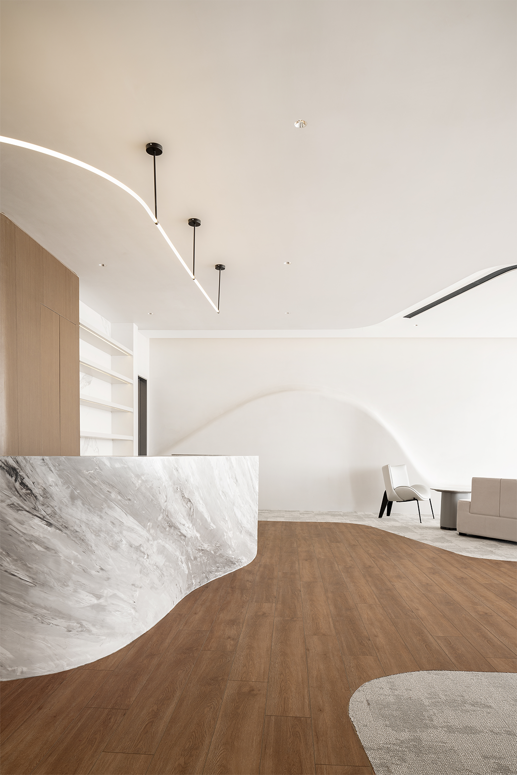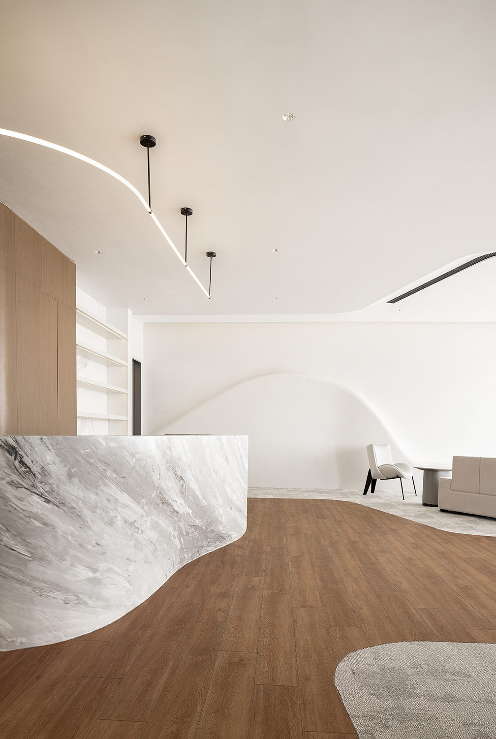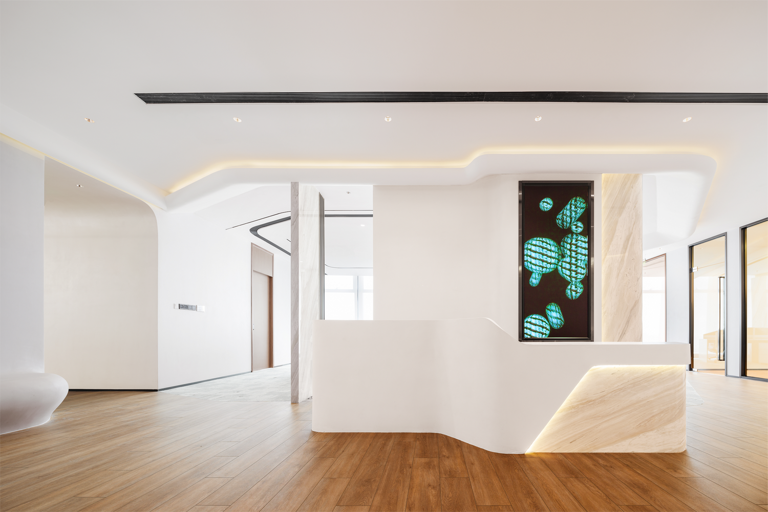 The overall design of the project adopts a blank design while meeting the basic needs of office.Reduce unnecessary decoration and utilize natural flowing lines and protrusions to turn the office into a "cave of the future."The main color of the office is white, and the wall decoration uses microcement paint.It seems simple, but it can highlight a variety of textures and colors in the changes of light and shadow, imitating the natural mottled colors in the rock wall.