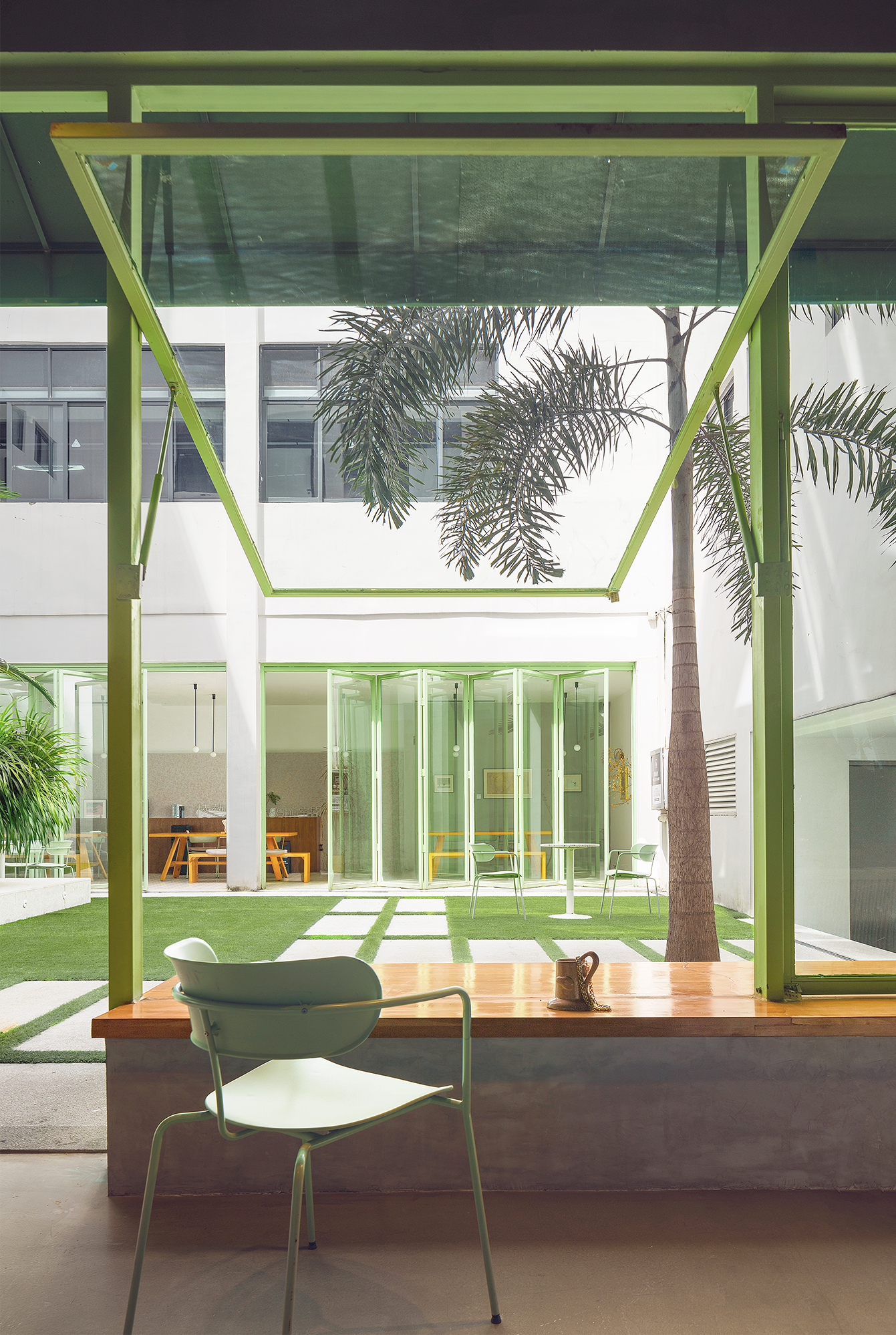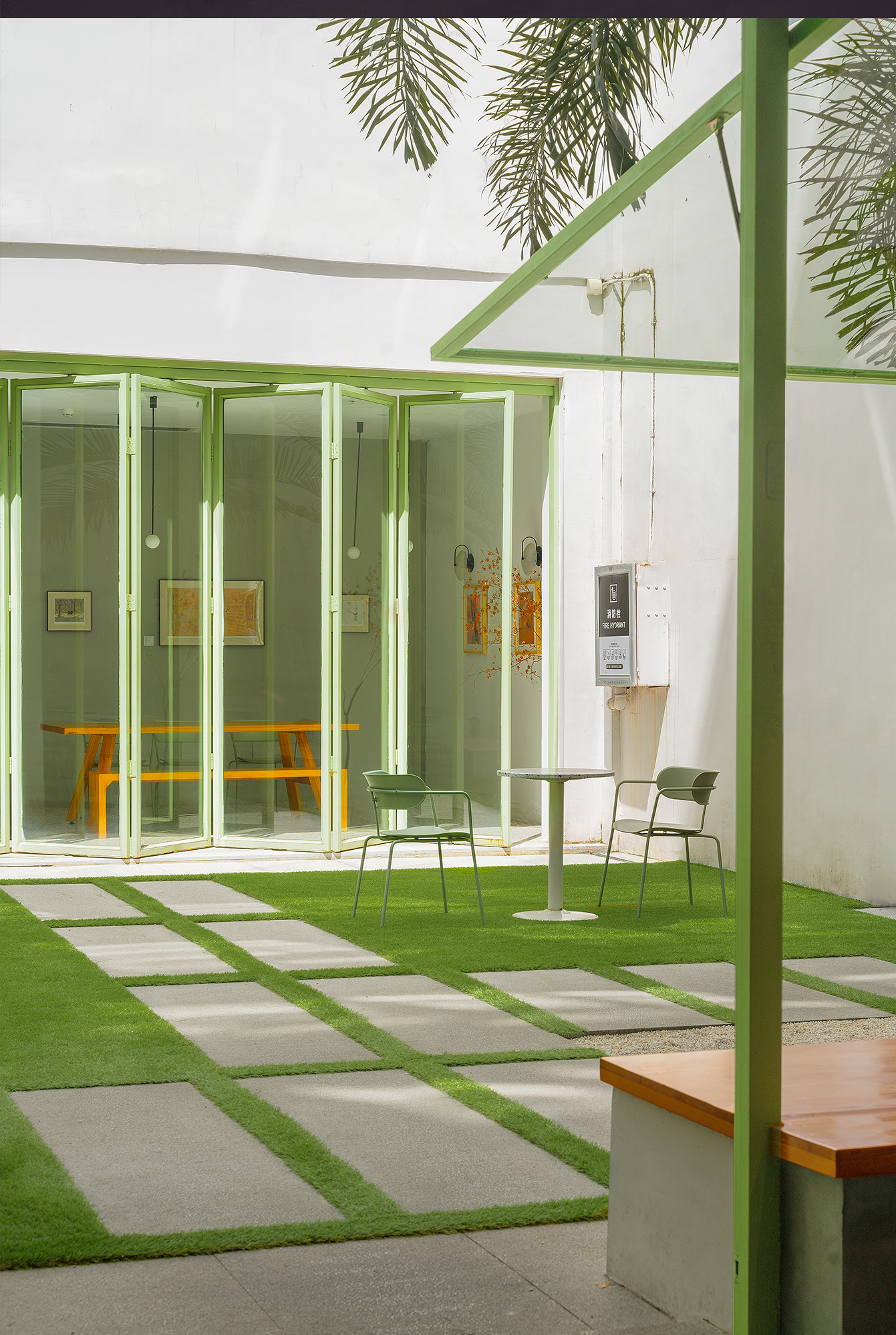 Entering the cafe through a small door, the space after entering is very open and bright. An entire wall of glass windows provides a direct view of the outdoor courtyard. The atmosphere of the front and back spaces is completely different, giving us a feeling like the Wuling fisherman in The Peach Colony who experienced 'very narrow at first, then opened into a flood of light'.