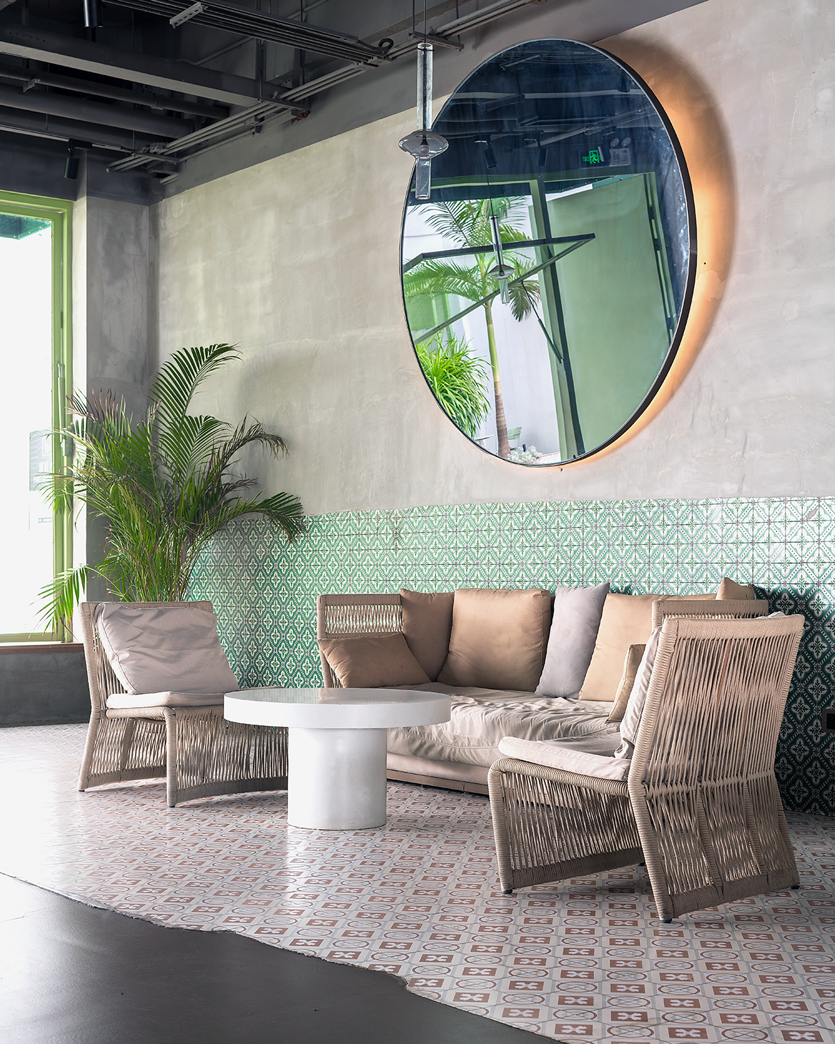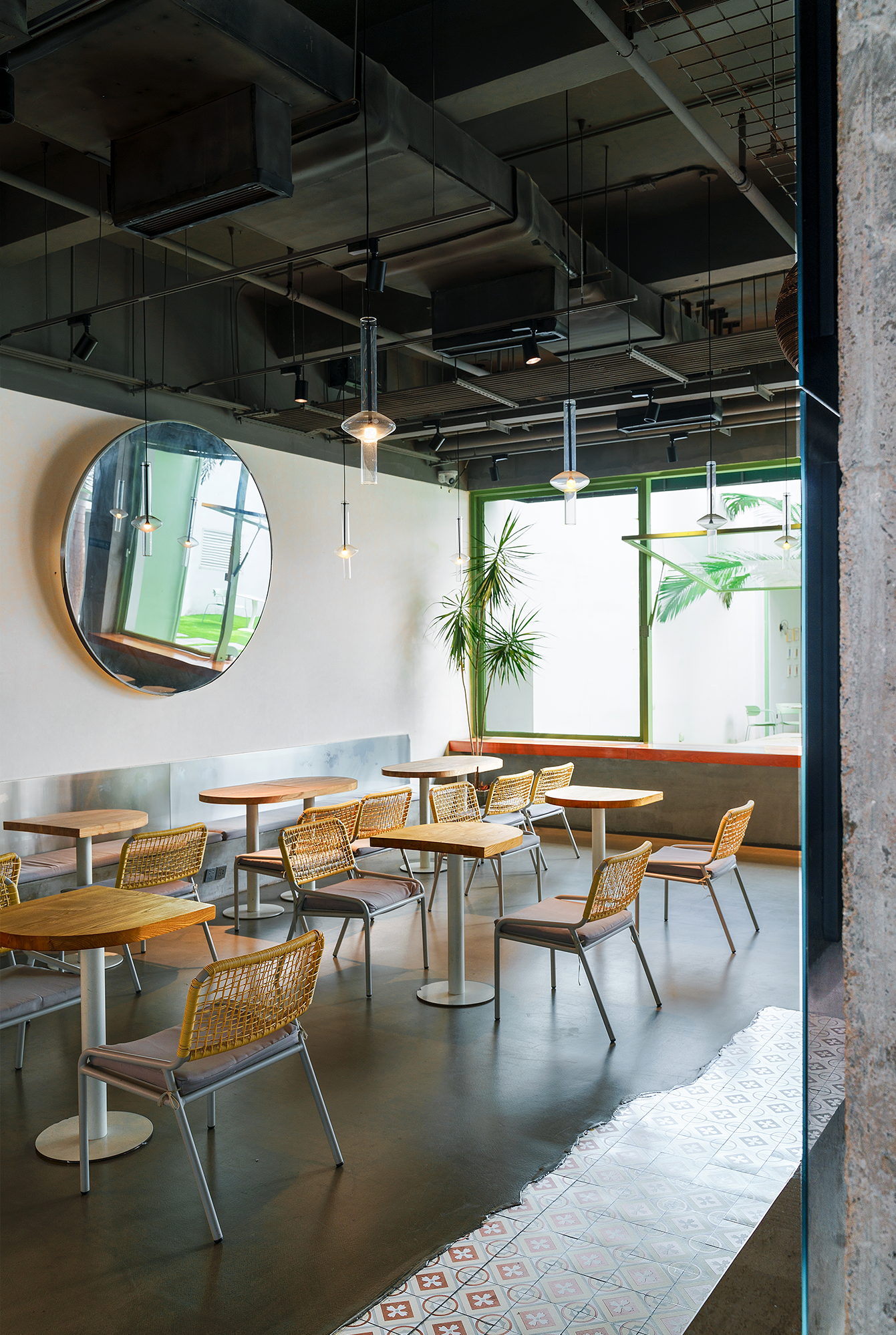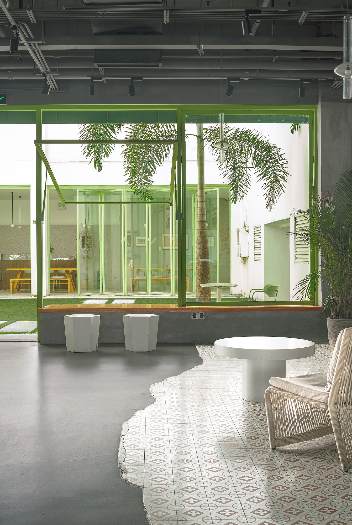 Cement, solid wood, stainless steel materials, avocado-colored metal and traditional Lingnan ceramic tiles, these elements are widely used in the design.The entire project uses bold shapes, colors and materials to intersperse and splice, dividing the interior space into four areas with clear functions and cultural integration.